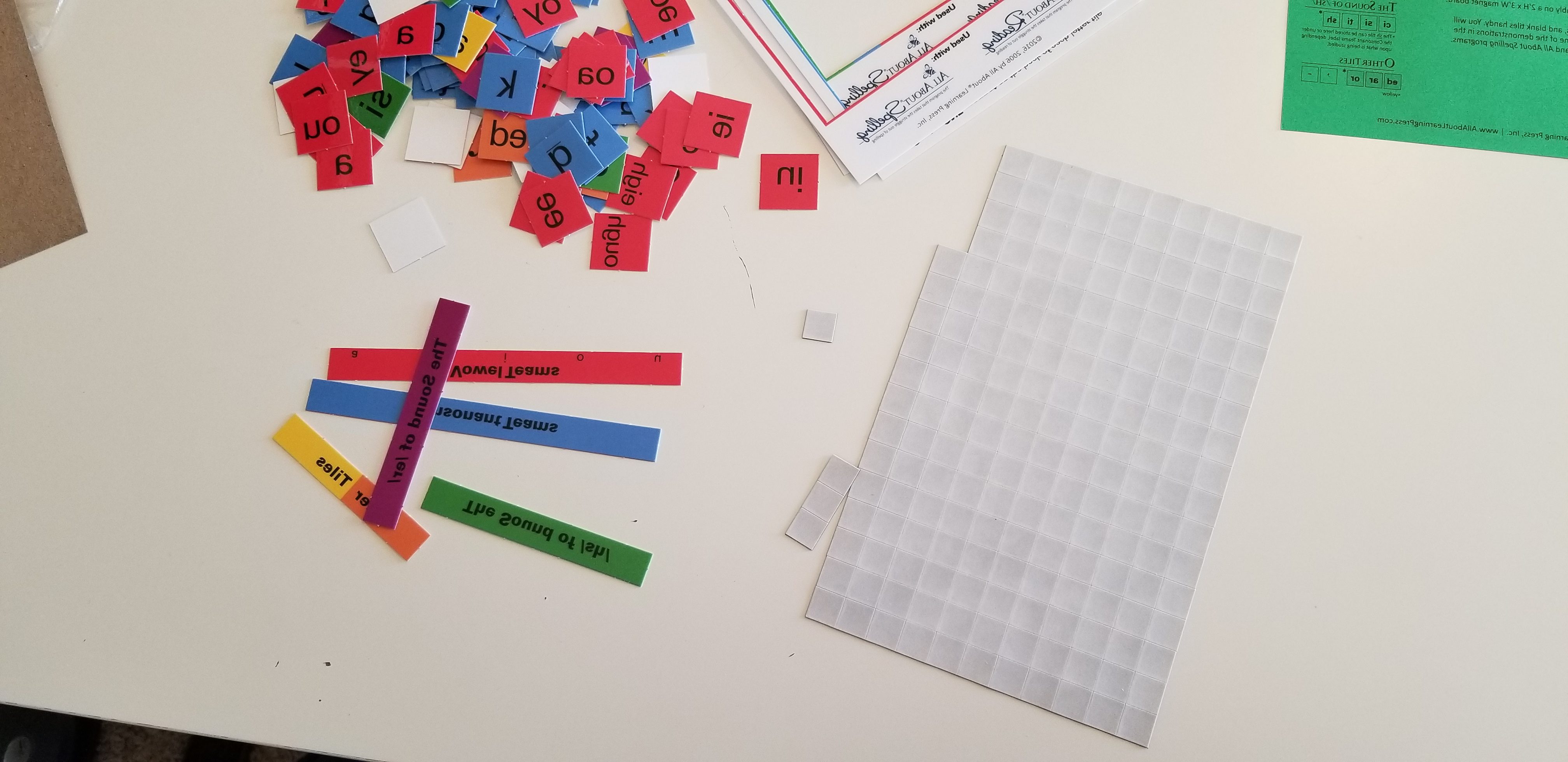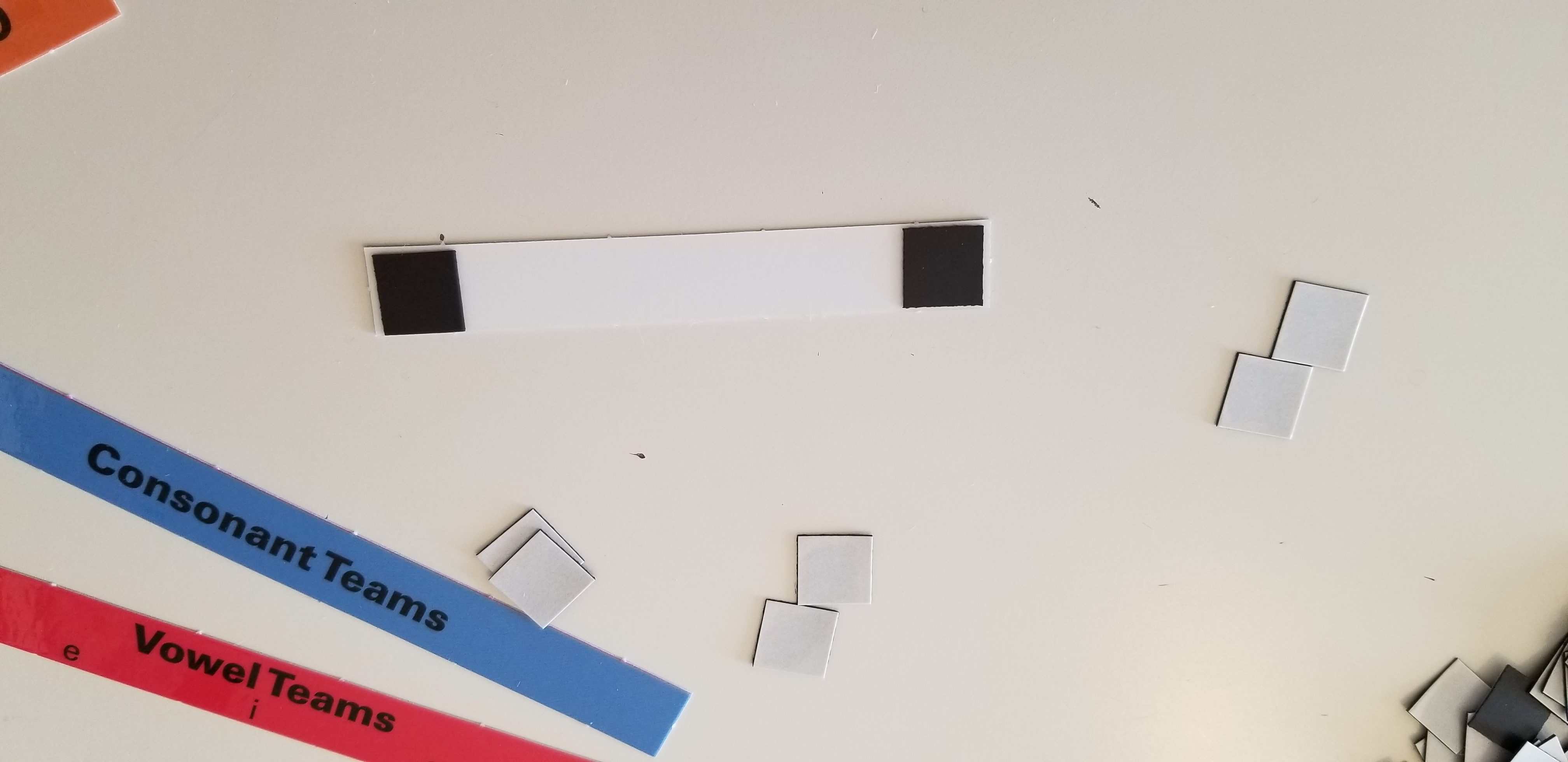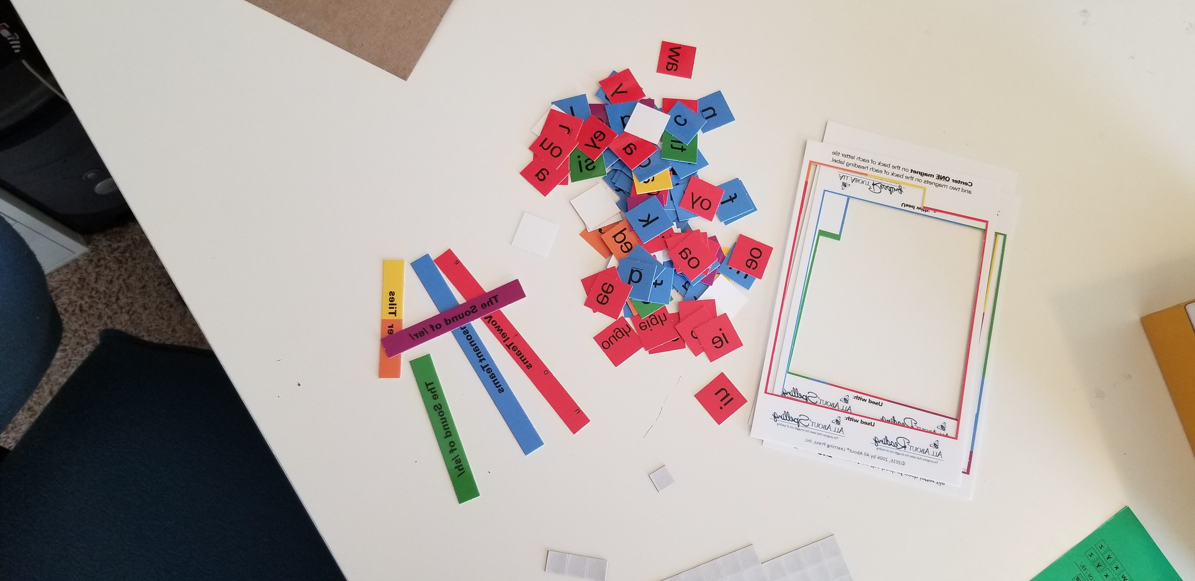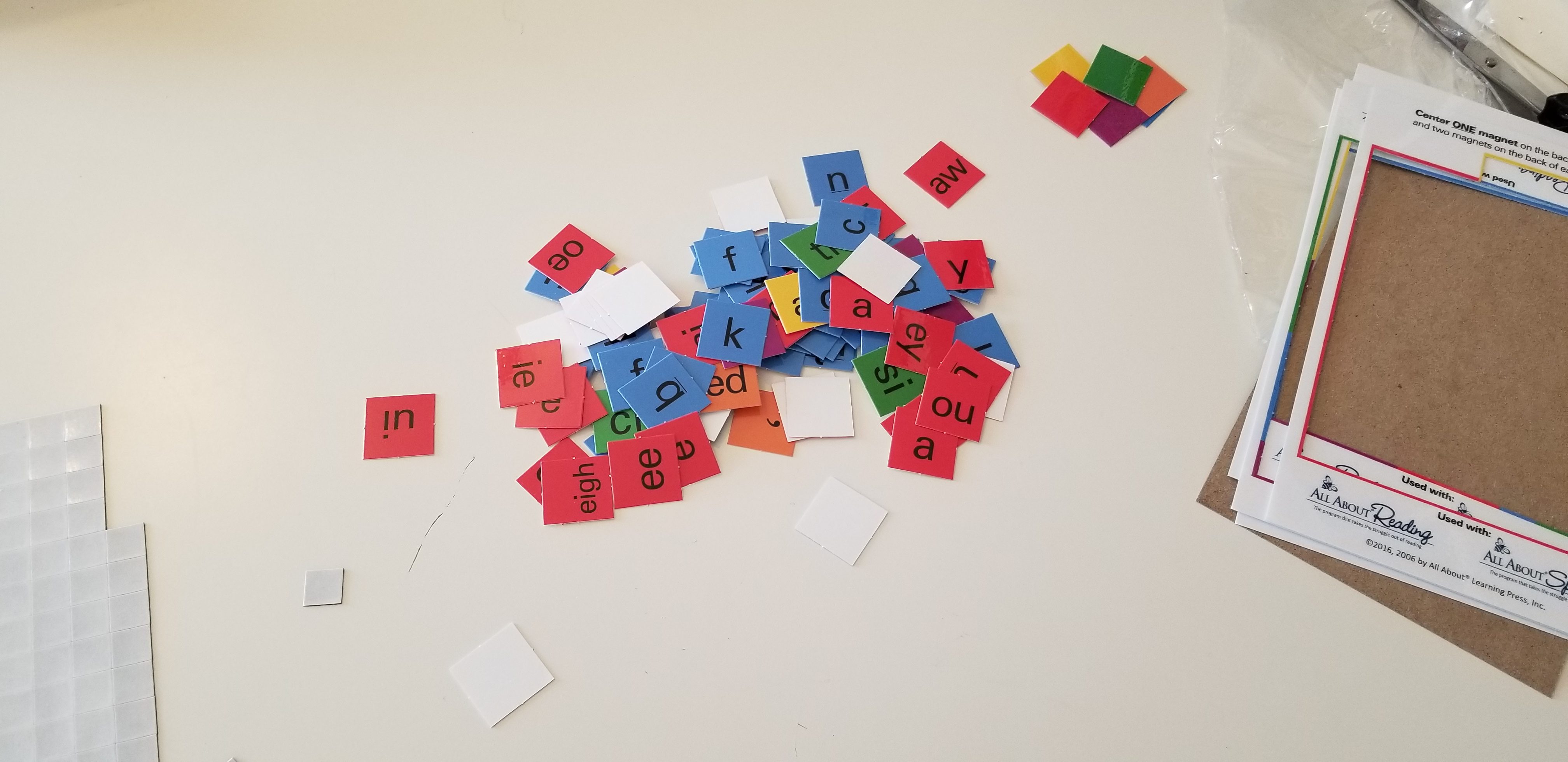 I started prepping the curriculum by working on the letter tiles. First I broke the magnets off of the sheet and made a pile, then I punched out the letter tiles. After that I attached all the magnets to the letter tiles and put them on the magnet board.Â