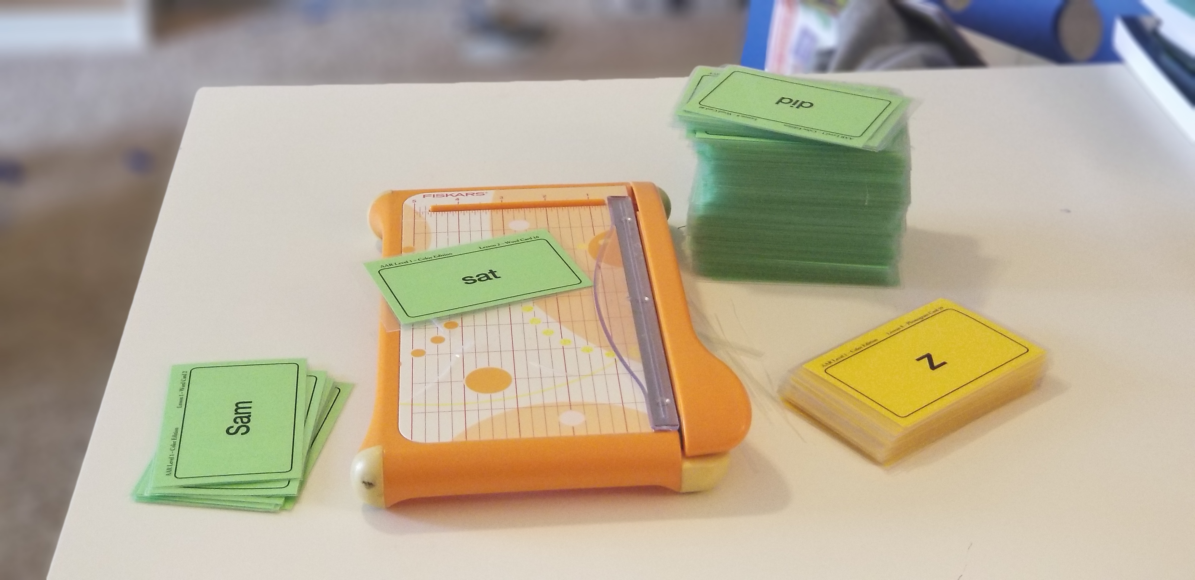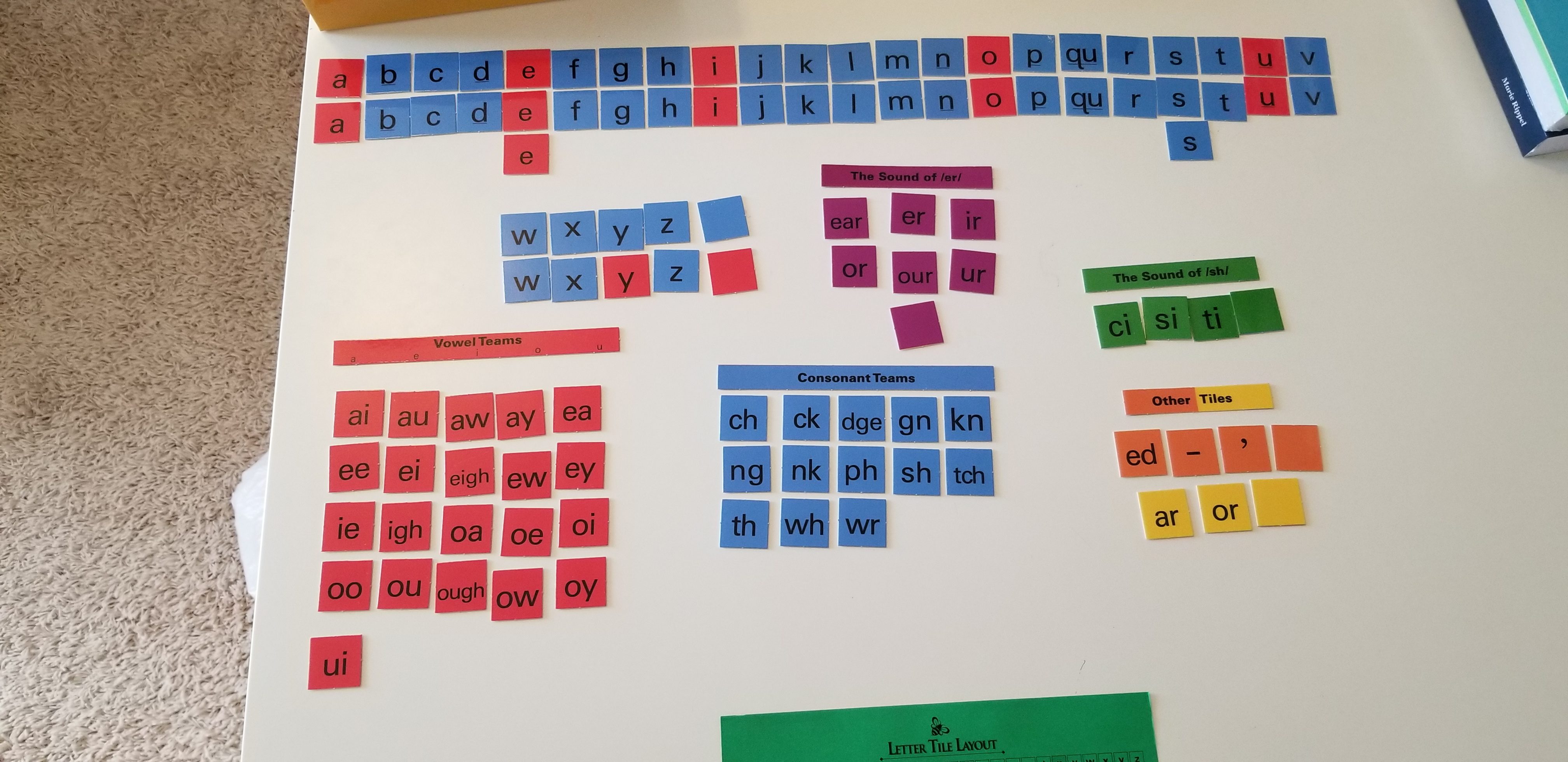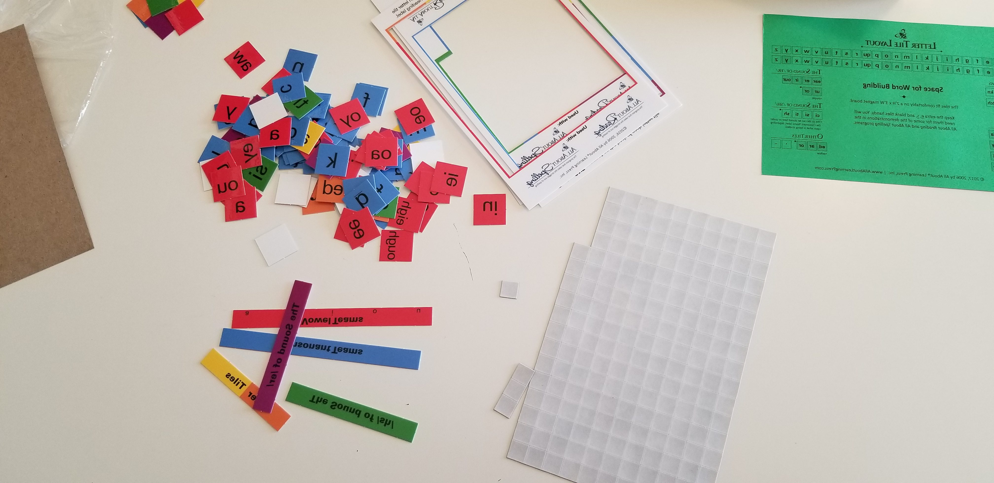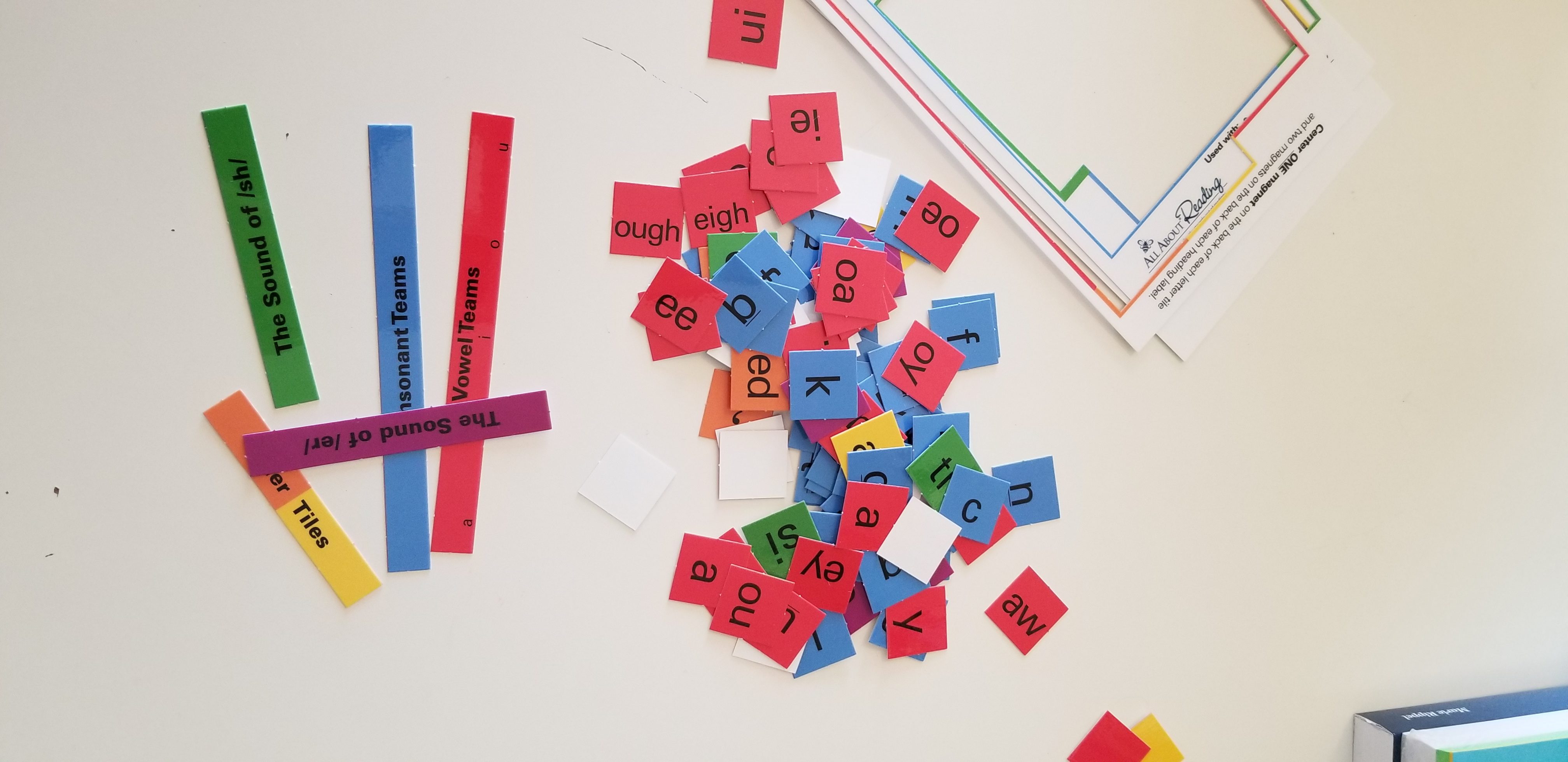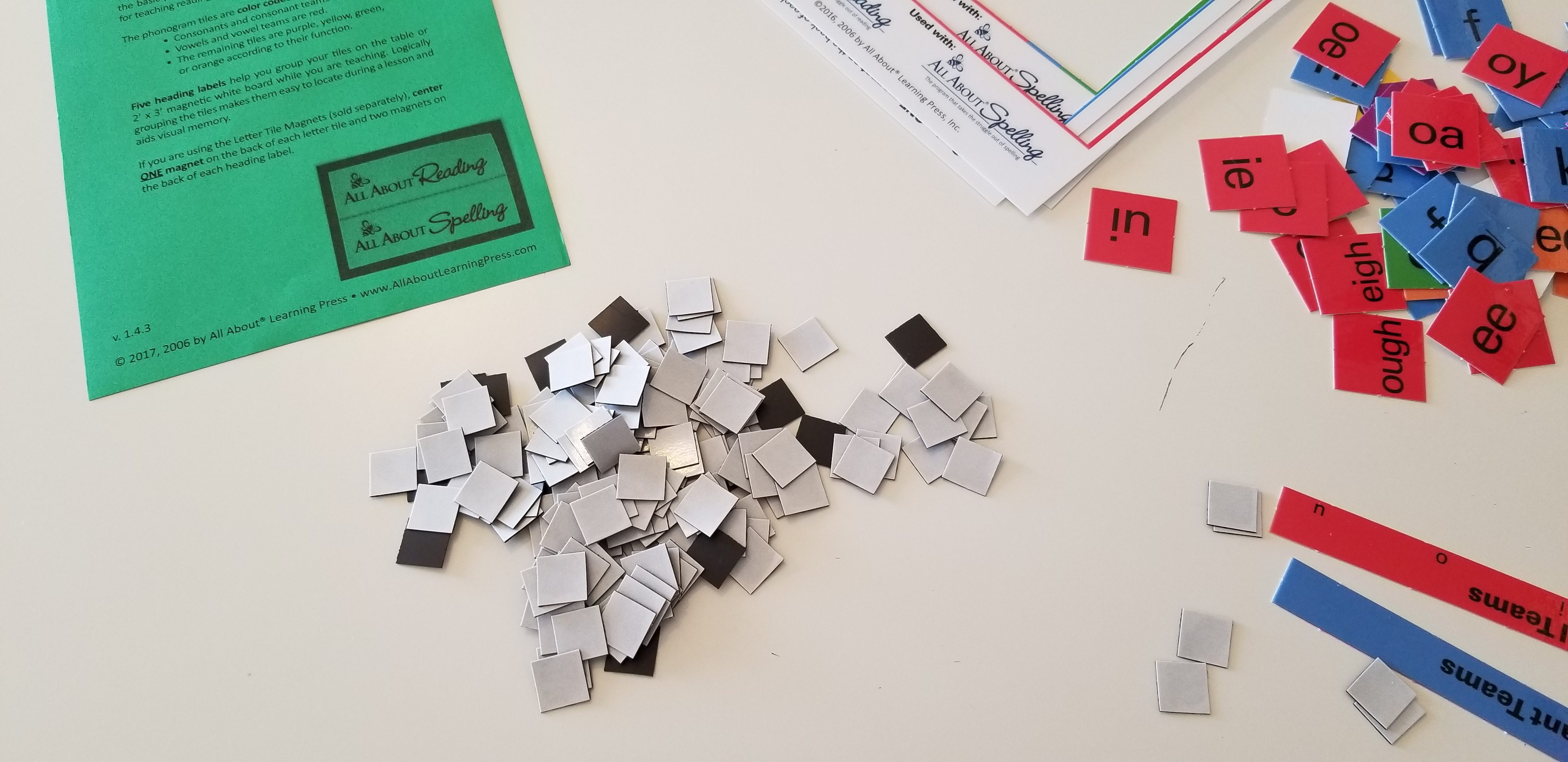 I started prepping the curriculum by working on the letter tiles. First I broke the magnets off of the sheet and made a pile, then I punched out the letter tiles. After that I attached all the magnets to the letter tiles and put them on the magnet board.Â