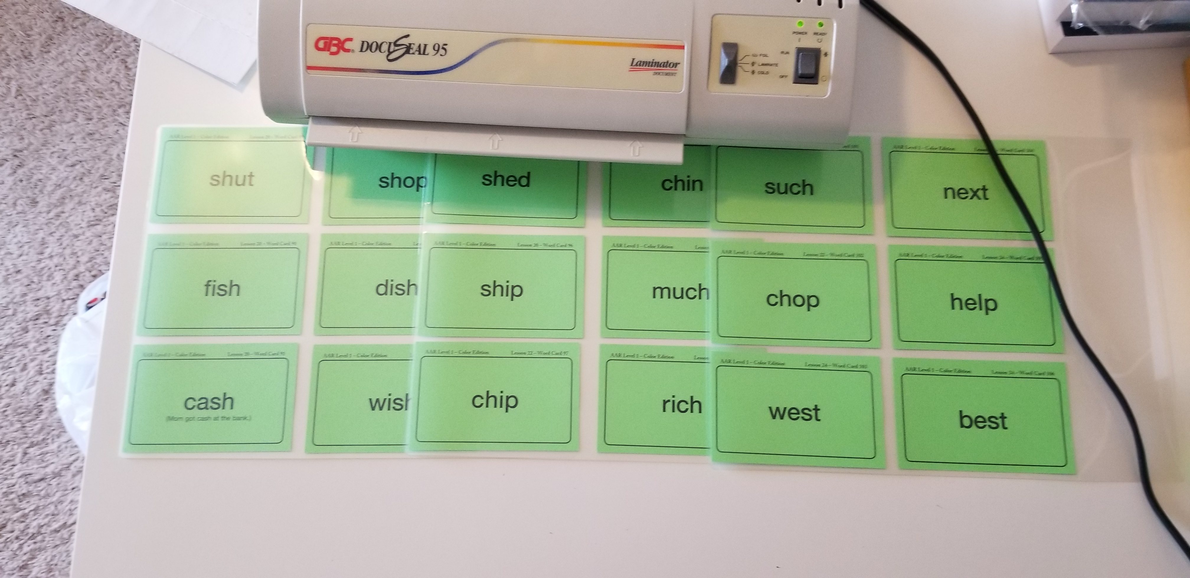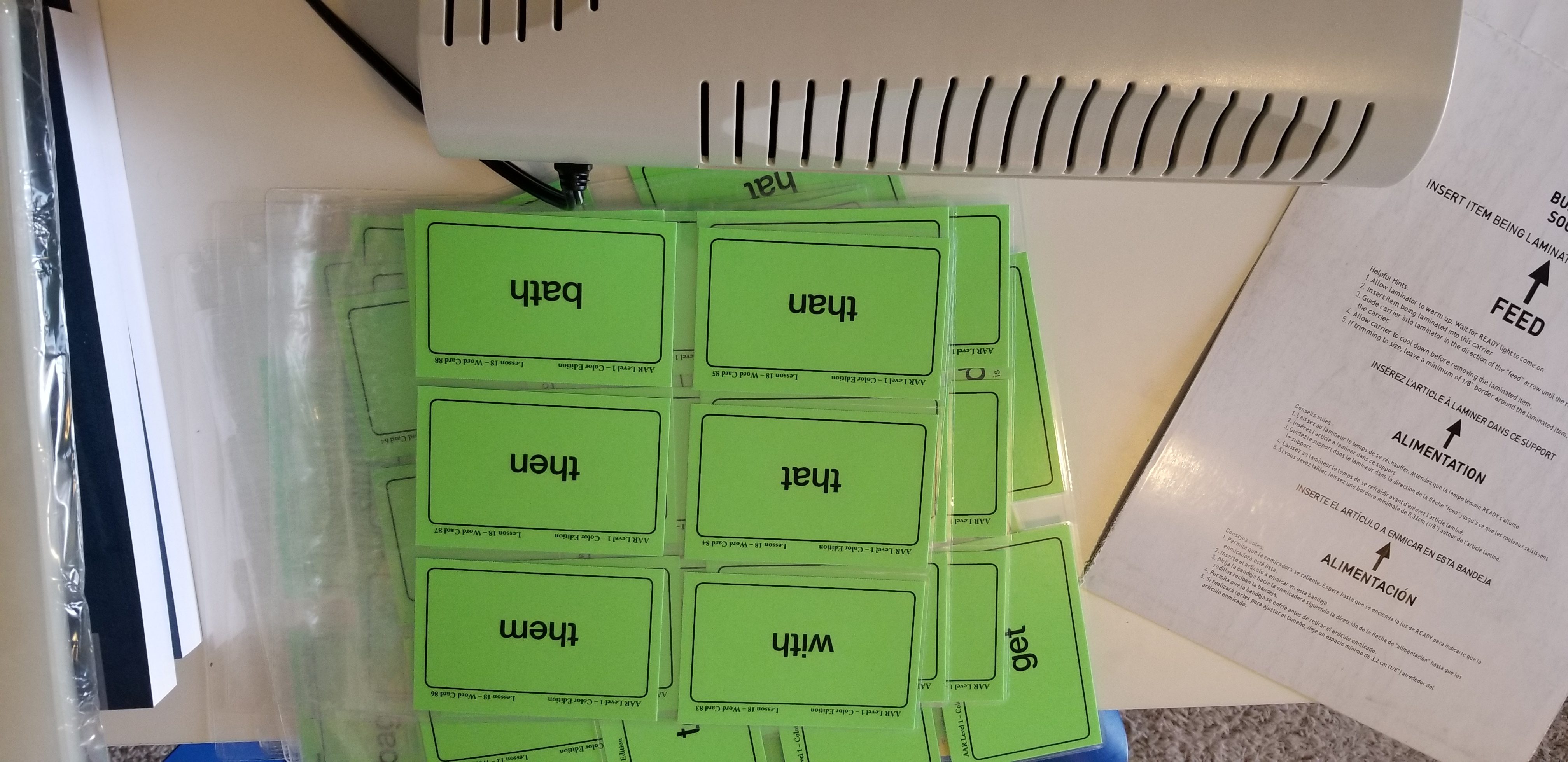 Once I finished with the word tiles I started taking apart the word cards. Each sheet had 6 word cards which I pulled apart at the perforation then put them in a pile. Since the word cards are printed on card stock I decided to laminate mine.