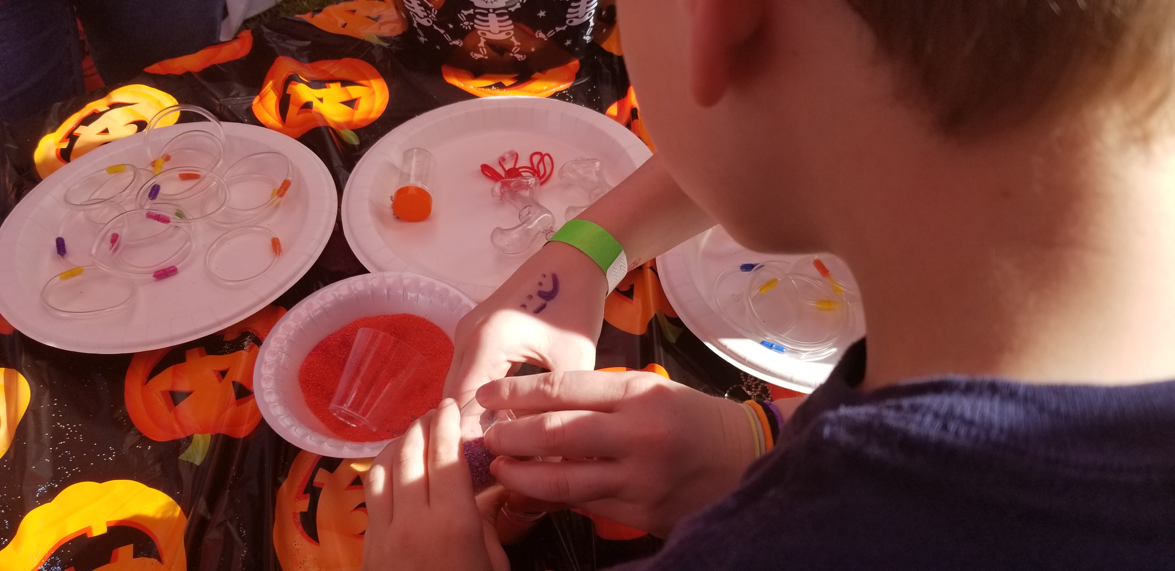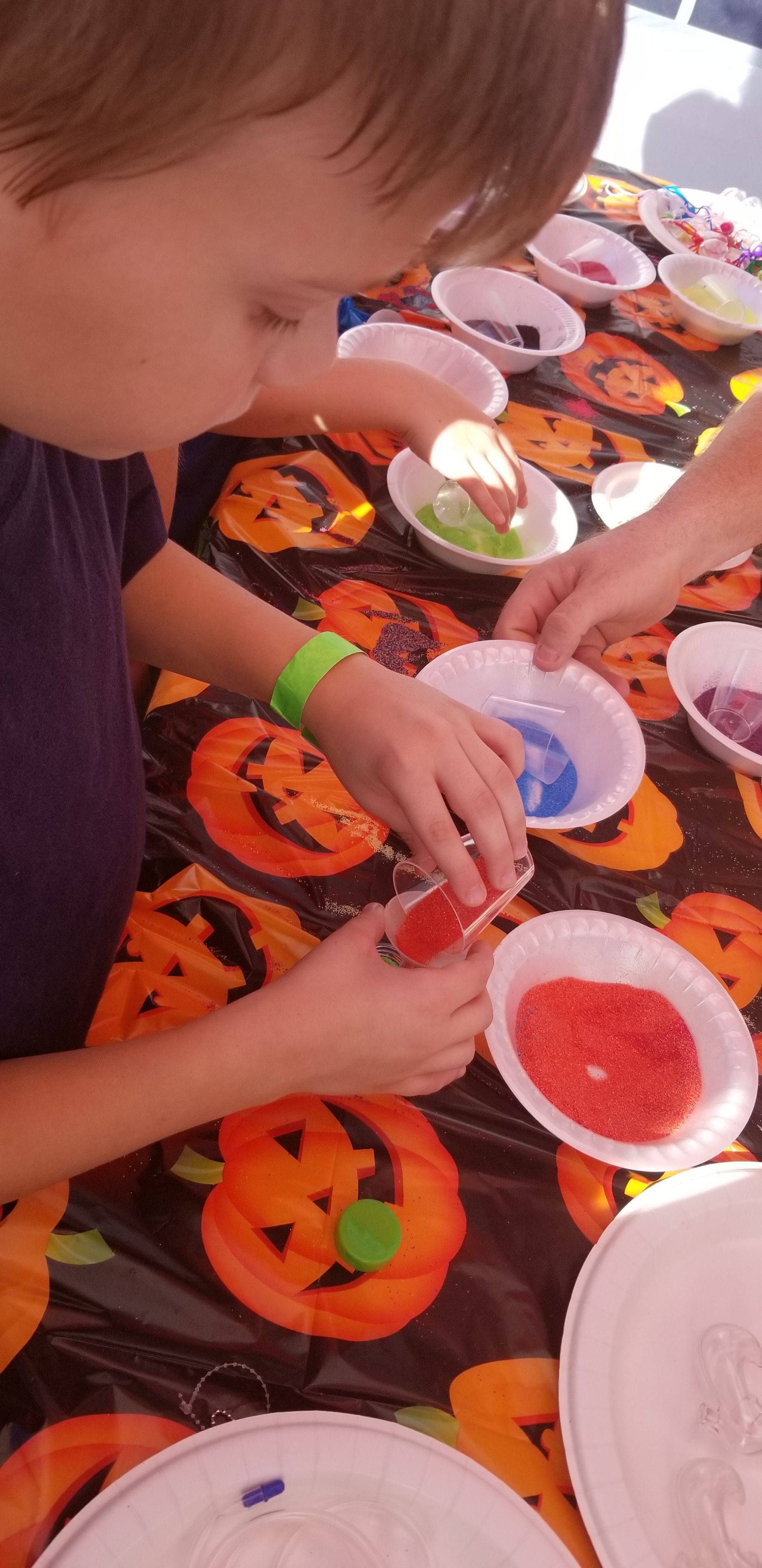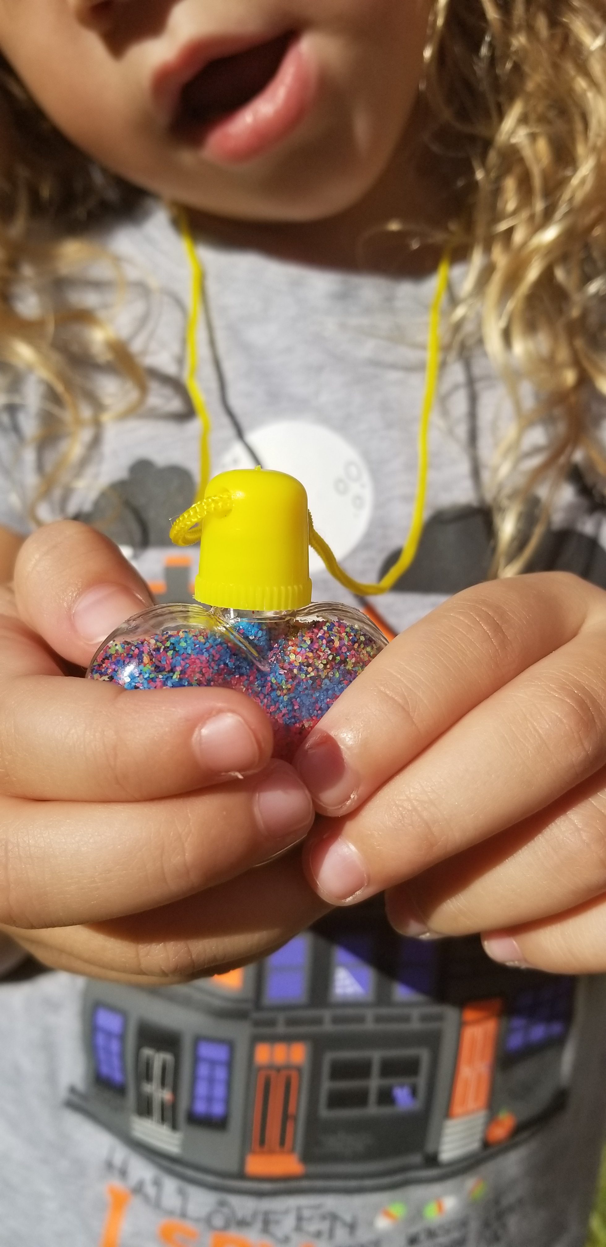 We headed straight over to the sand art table to make necklaces. This  was a lot of fun! They had different bottle shapes including shapes for Halloween. How cool is that! I only managed to keep Caroline still long enough to get a picture, the other kids had already run off.