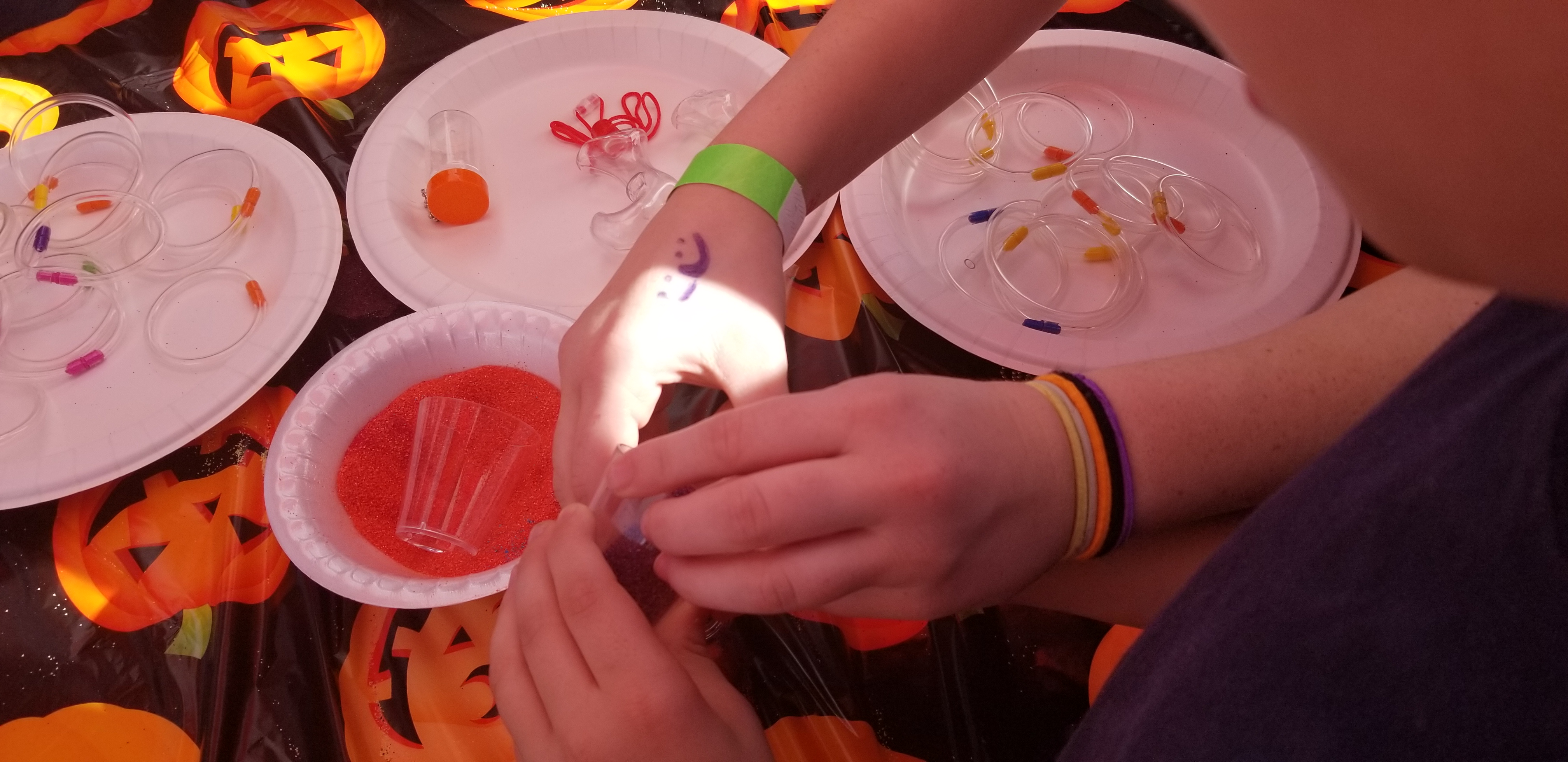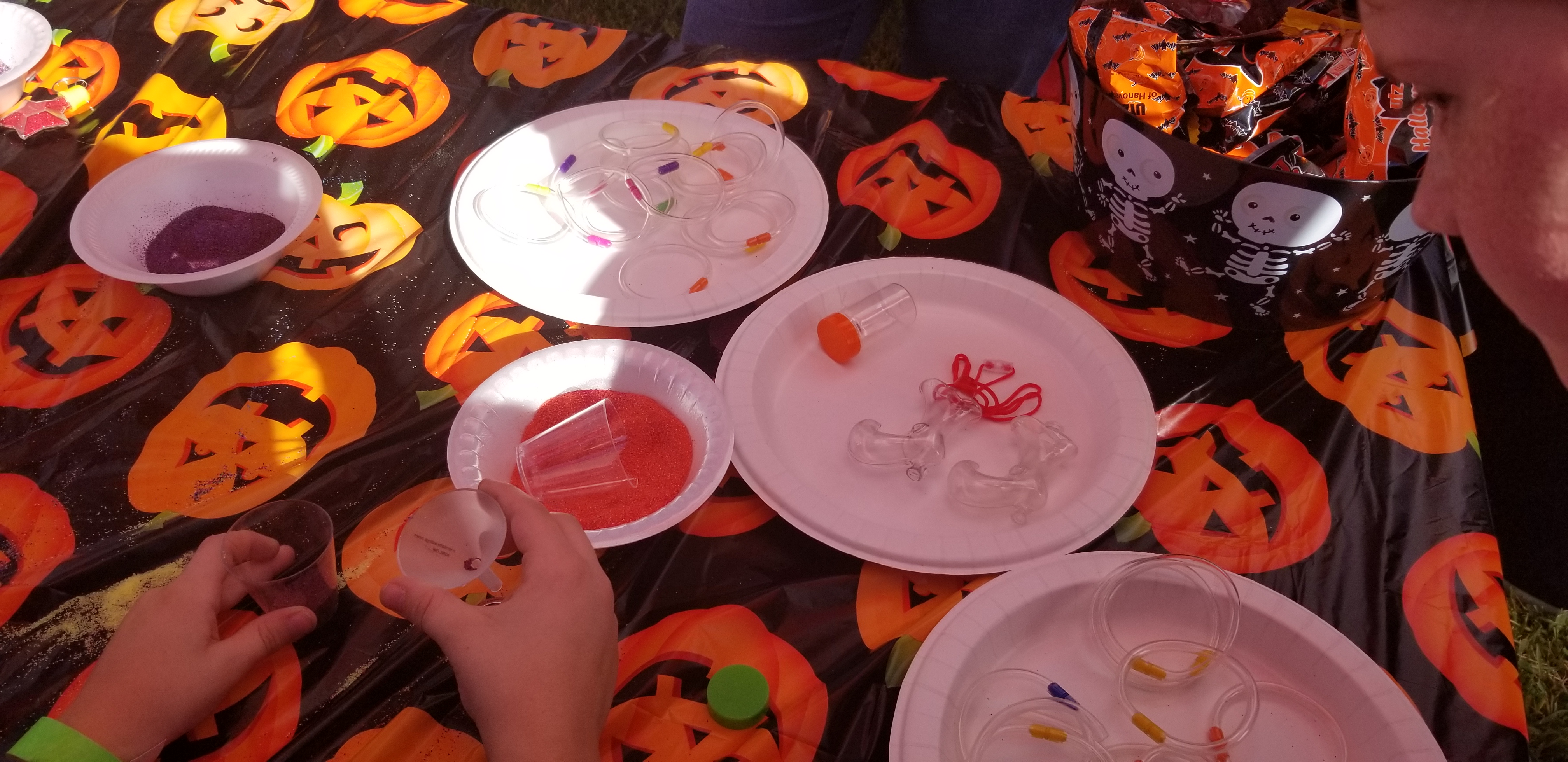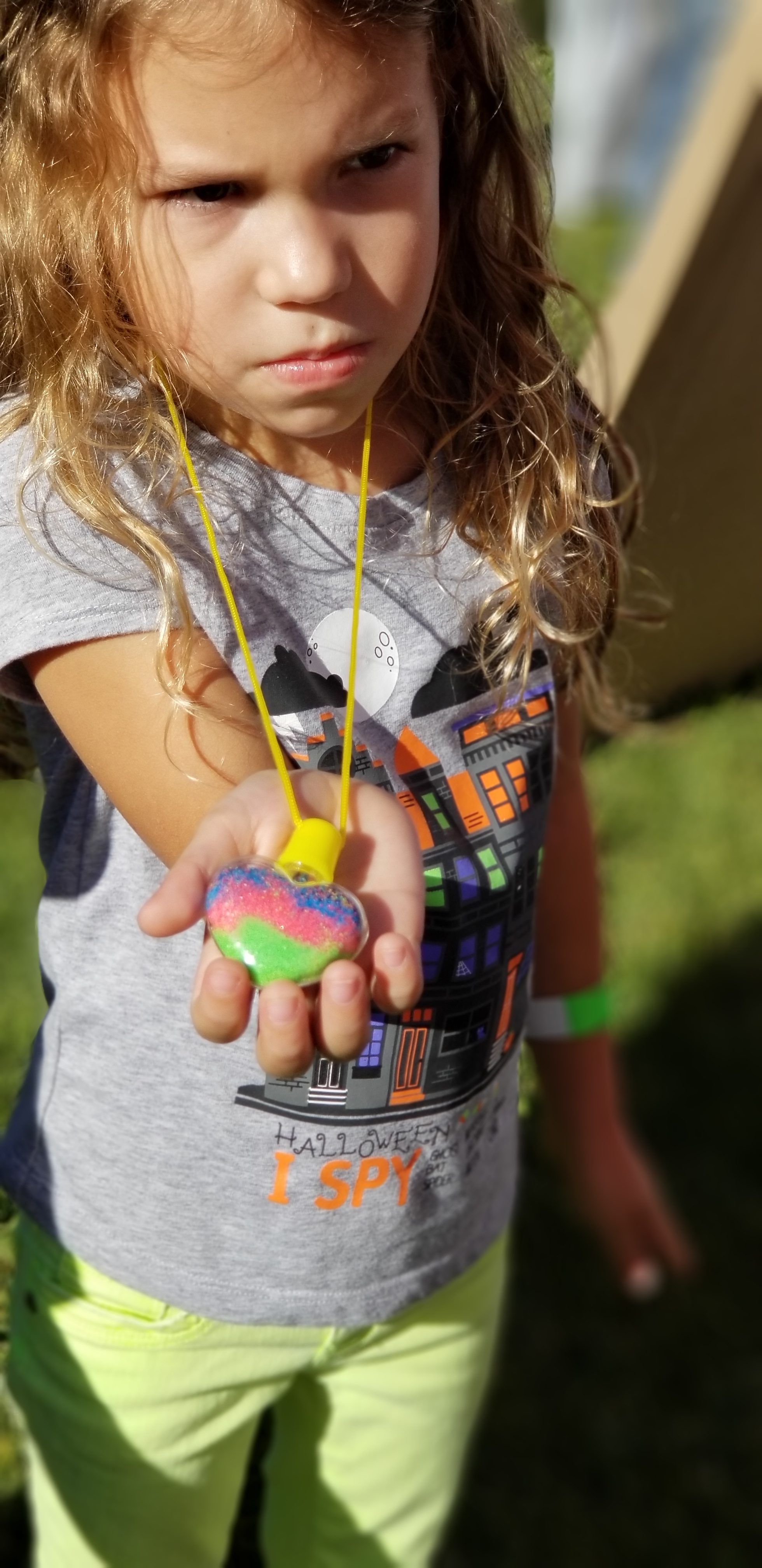 We headed straight over to the sand art table to make necklaces. This  was a lot of fun! They had different bottle shapes including shapes for Halloween. How cool is that! I only managed to keep Caroline still long enough to get a picture, the other kids had already run off.